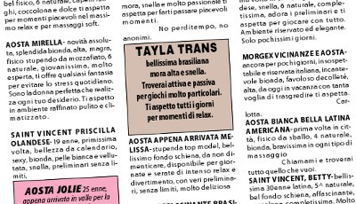 L'altro giorno, in un residuato stradale sulla statale, poco prima di Chambave, ho visto spuntare, anche in Valle d'Aosta, l'ultima modalità di prostituzione da strada, visibilissima da sempre lungo le strade in pianura: la prostituta con sedia di plastica al seguito, seduta ad aspettar clienti. In Valle di "professioniste" ce ne sono parecchie, come dappertutto. Alcune sono "lavoratrici autonome", ma la maggior parte sono inquadrate da "protettori" di vari livelli: dal balordo di turno alla criminalità organizzata. La variante originale in Valle è rappresentata dalla "mondana" (come si scriveva una volta sui giornali) automunita, che si posiziona in modo strategico, più o meno sempre nella stessa piazzola, con allettante scorcio di gamba o sorriso ammiccante. Mentre più usuali sono la modalità agli angoli della strada o da "bar simpatici" - come avviene, con entrambe le tipologie, a Saint-Vincent - o la modalità dell'appartamento "ospitale" che, leggendo certi annunci sui giornali, ha consentito in qualche zona di Aosta un boom delle locazioni. Intendiamoci subito: io non ho alcun intento moralistico nello scrivere di queste cose, perché solo in Italia si può accettare che una legge del 1958, la famosa "legge Merlin" - dal nome della deputata socialista Lina Merlin - che abolì giustamente le "case di tolleranza o chiuse" ("casini" o "bordelli" nel linguaggio corrente) dell'epoca, sia ancora in vigore, in un mondo che muta e basta pensare - in ultimo - alle diverse modalità di uso della Rete. La filosofia italiana, che dice "chiudiamo una cosa e eliminiamo il problema" si è dimostrata ipocrita: l'offerta si è scaricata sulle strade e perfezionata in tratte di ragazze a livello internazionale e corrisponde - girala come vuoi, ma è così - ad una domanda che è insita nella natura umana e non solo al maschile. Per cui logiche dei divieti da proclama e non regolatrici del problema - fiscalità compresa - non portano da nessuna parte, perché "fatta la legge, trovato l'inganno" e in Italia gli inganni, che hanno ingrassato le mafie, durano da più di cinquant'anni. Pare ormai certo che saranno chiamati ad esprimersi i cittadini, per un referendum già depositato in Cassazione, che prevede un'abrogazione totale della legge Merlin, il nome con cui è appunto la nota la legge 20 febbraio 1958 numero 75. Ma vi è anche la raccolta di firme in corso, su spinta di sindaci veneti, per una sua abrogazione parziale. Un referendum, minacciato e svolto, costringerà il Parlamento - sonnolento sulla materia per una serie di ragioni - ad occuparsi della questione. Nell'Unione Europea il tema di un'armonizzazione legislativa è finora un tabù e non sarebbe facile, visto che si va dal proibizionismo totale, con prostituzione vietata per legge, come in Svezia, a forme di regolamentazione per legge in Paesi come Germania, Olanda, Svizzera, Austria, ma anche Grecia, Regno Unito, Ungheria e Lettonia. Formule diverse che si sommano a situazioni di apertura di fatto ma non di diritto, compresa appunto l'ambigua situazione italiana, ormai sfuggita di mano e piena di formule creative per ingannare la regolamentazione obsoleta, con le Forze dell'ordine spesso nell'impossibilità di agire. E' bene che un referendum riapra il dibattito, obbligando a decisioni certe e definitive, in linea con i tempi e ovviamente con una logica di tutela per chi scelga - per propria decisione - di praticare questo mestiere. Chi dice il contrario o ha gli occhi ricoperti di pelle di salame o è in malafede.